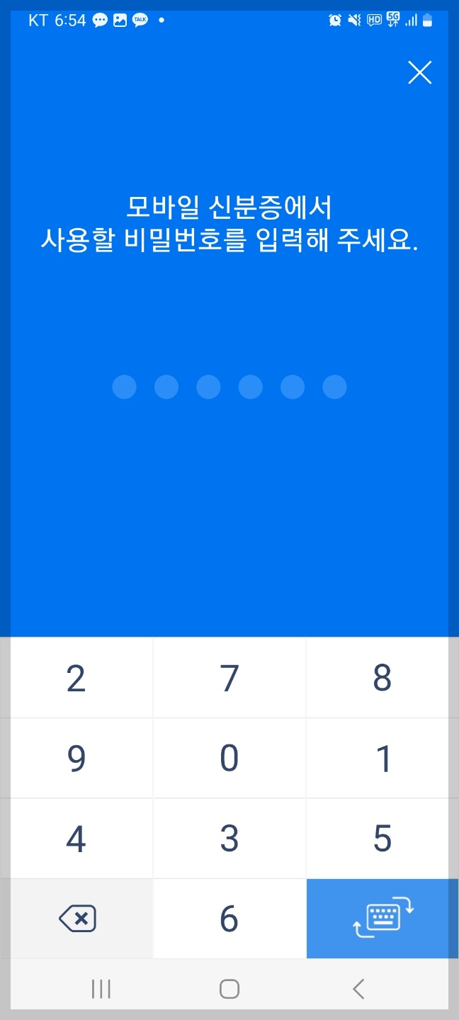 본인 이름과 주민등록번호 입력 후 통신사를 선택하고 모바일 신분증에 사용할 비밀번호 6자리를 입력합니다.